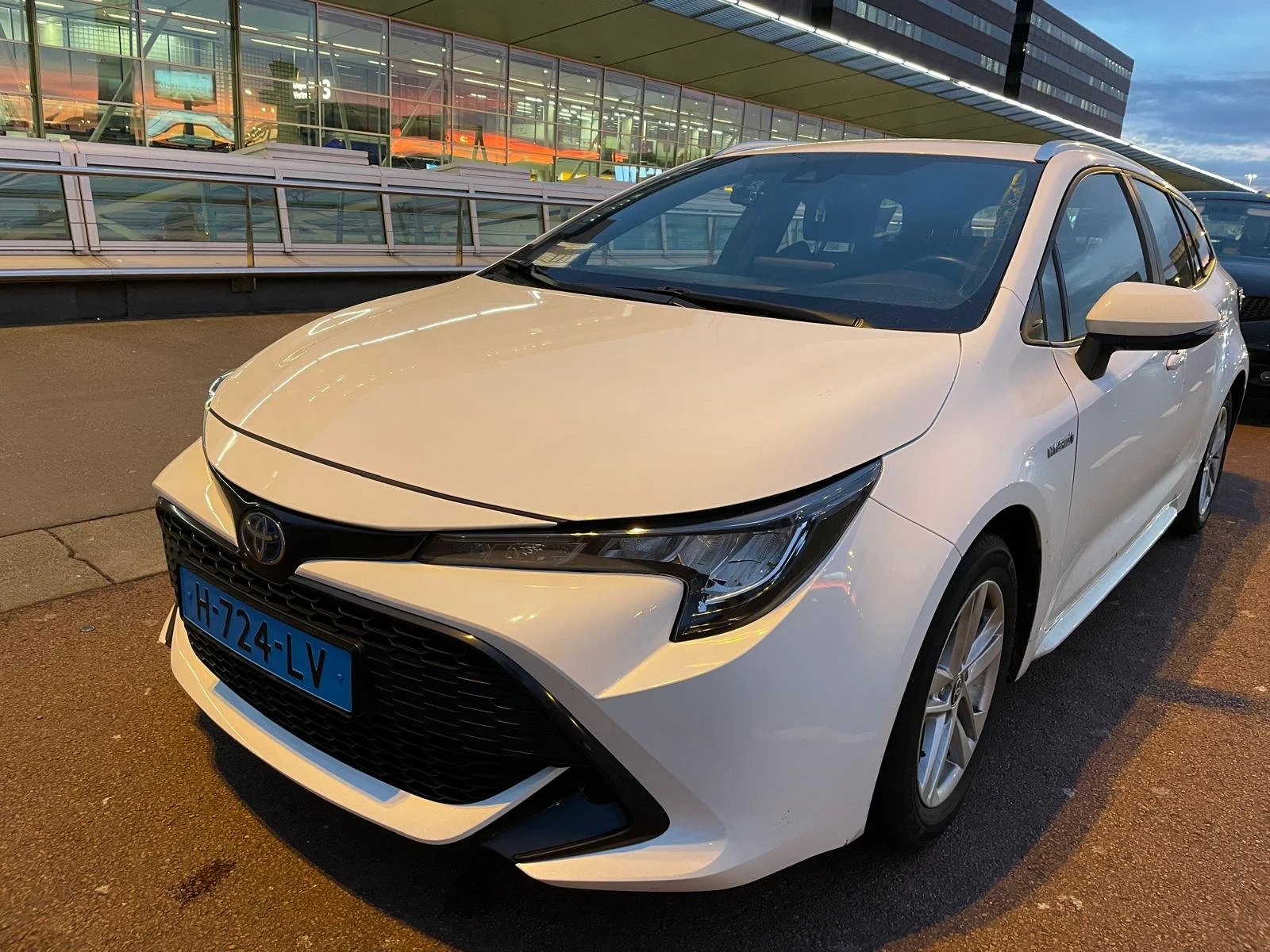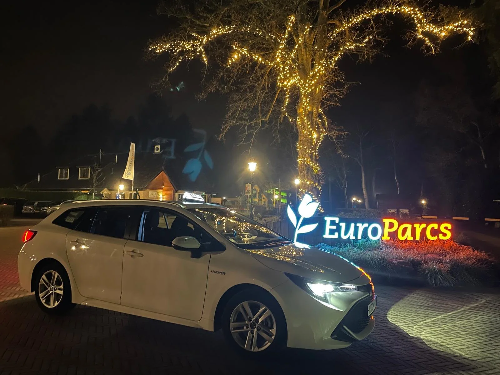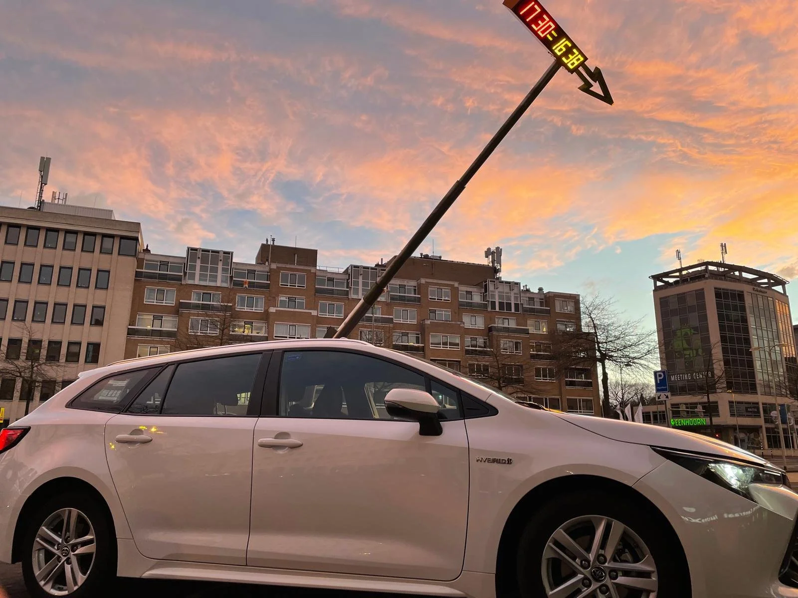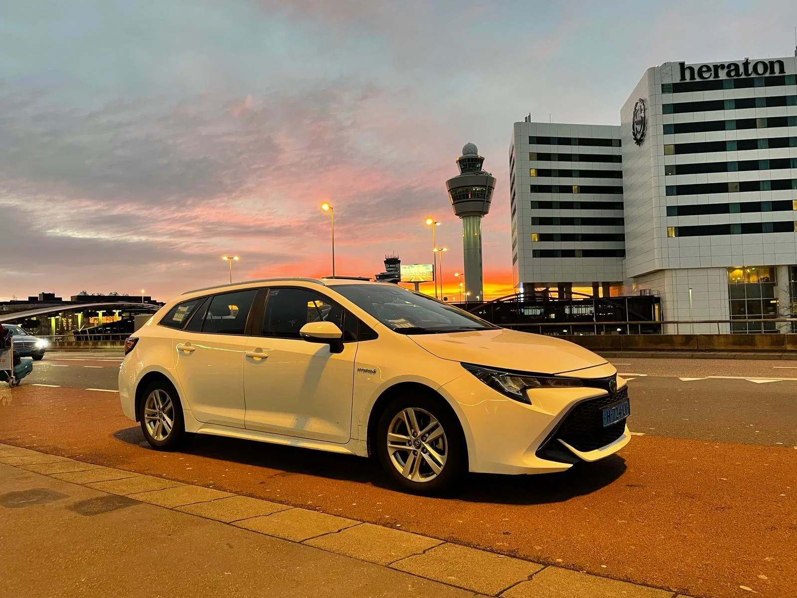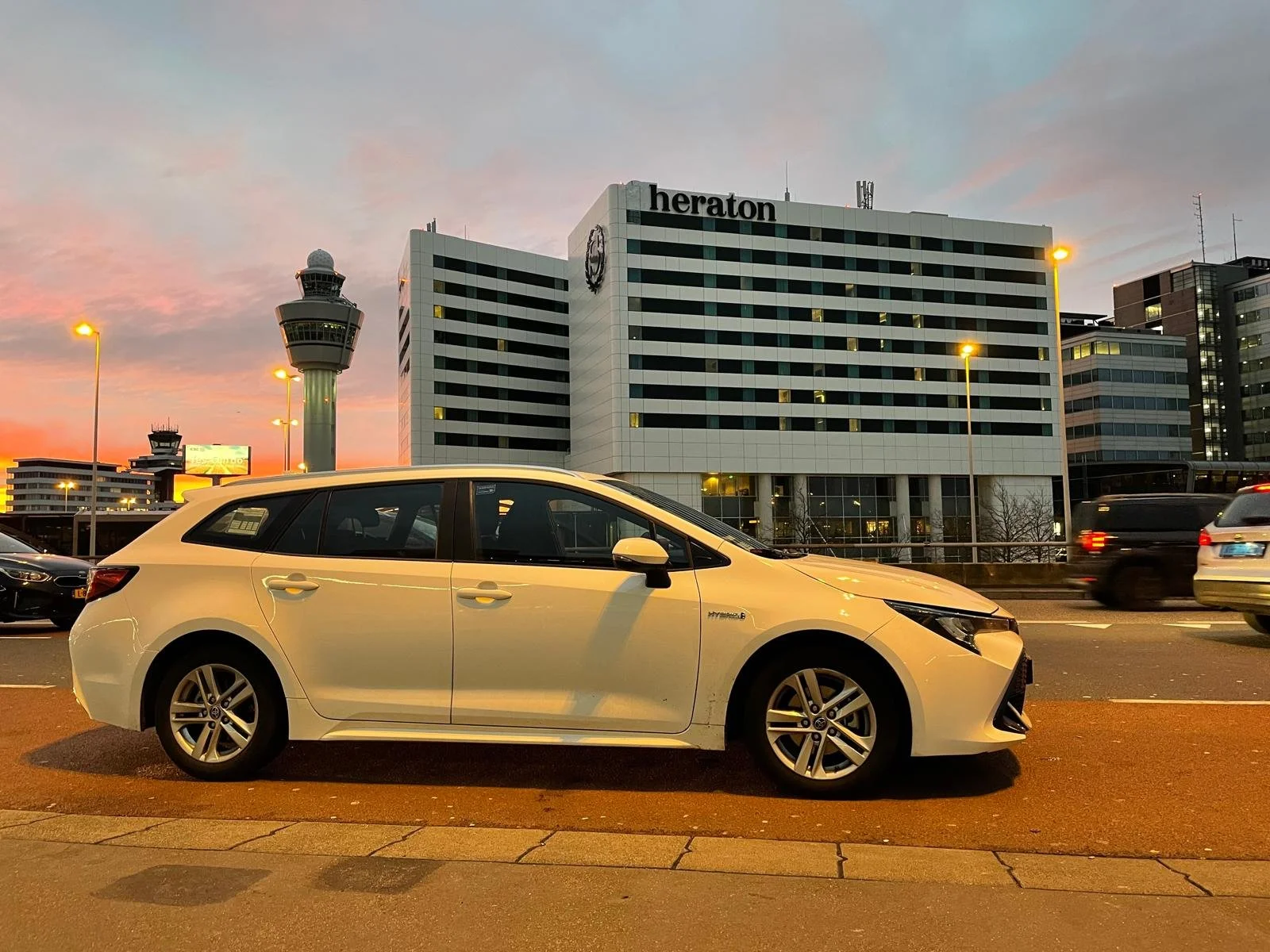 Witte auto voor het Sheraton Hotel bij zonsondergang op luchthaven Schiphol.